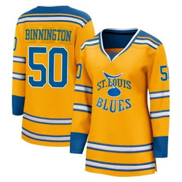 Home St. Louis Blues Jordan Binnington Women Blue Jerseys Jordan Binnington Authentic Reverse Retro 2.0 Yellow Jersey